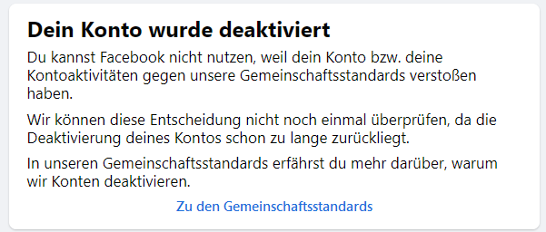 Du bist dauerhaft von Facebook ausgeschlossen. Es sei denn, a) du stellst einen Antrag auf Überprüfung und b) dieser Antrag ist erfolgreich.